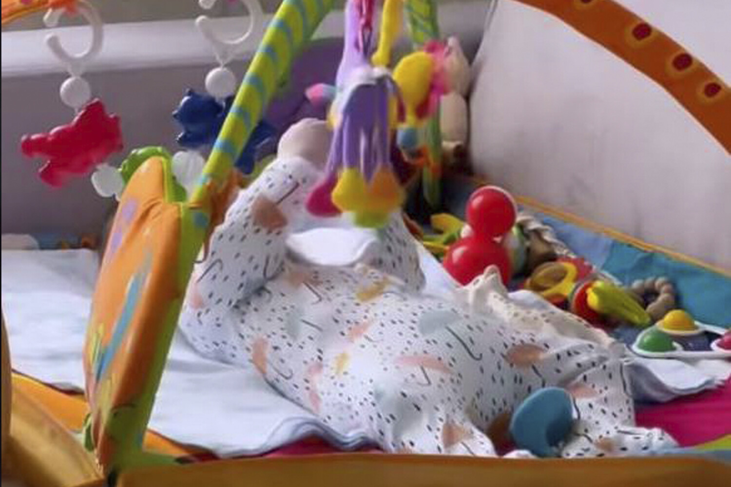 Так, блогерша опубликовала видео с девочкой, которая лежала на детском развивающем коврике и играла с игрушками. Девочка была одета в белый комбинезон с нарисованными цветными зонтиками и черными капельками дождя.