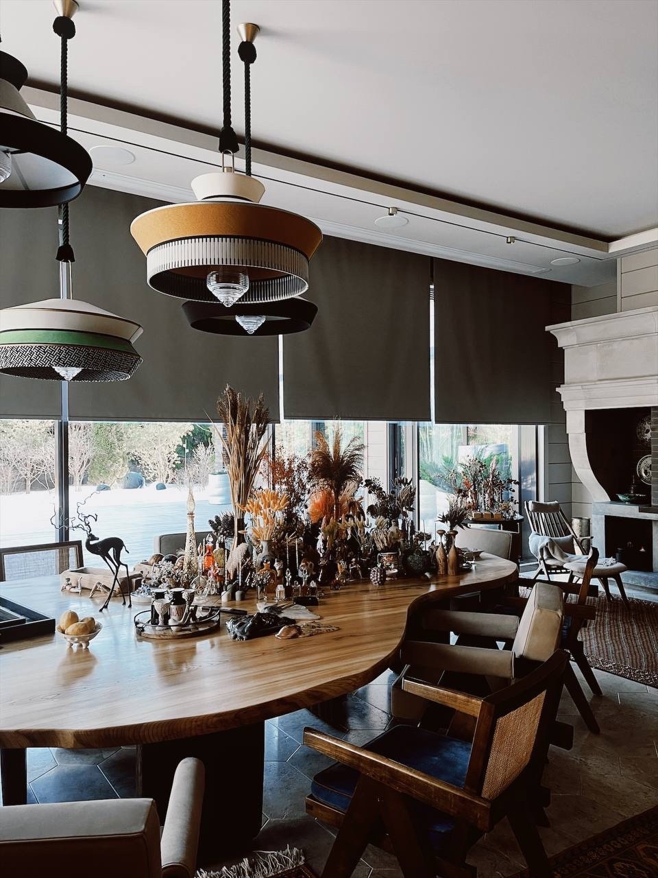 Так, на фотографии видна часть комнаты: панорамные окна с темными жалюзи, длинный изогнутый деревянный стол, стулья с бархатными подушками, подвесные светильники и камин. При этом, стол украшают вазы с сухоцветами, статуэтки, поднос со свечами и шкатулка.