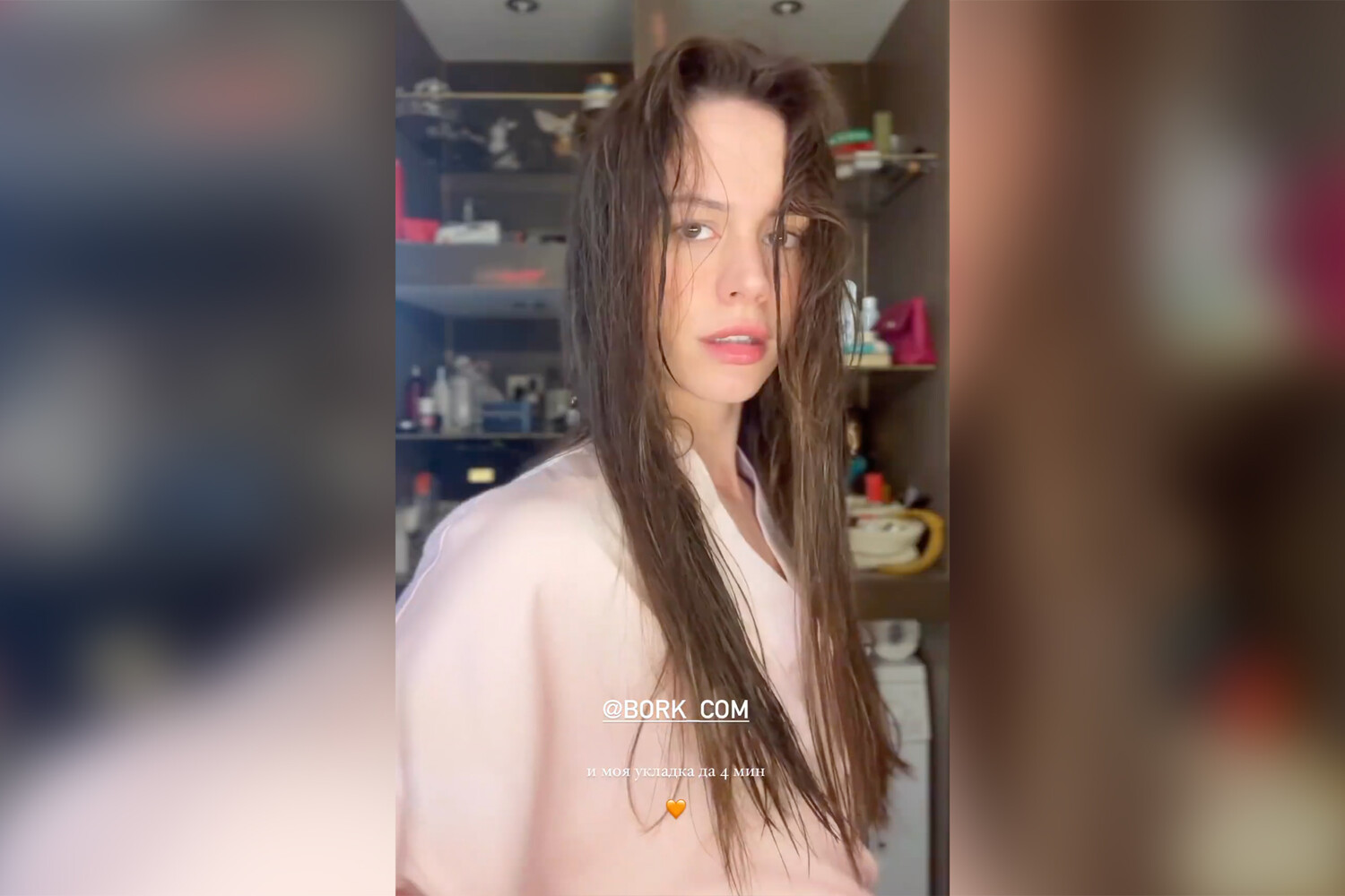 В коротком видеоролике она продемонстрировала процесс создания укладки с помощью стайлера и показала результат своего преображения. Съемка проходила в ванной актрисы, где были видны шкаф и зеркало.