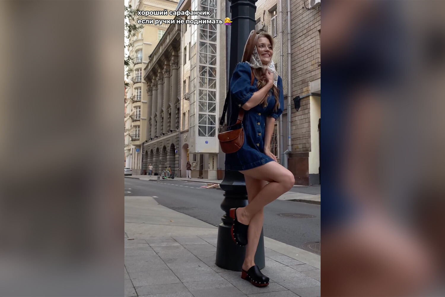 Так, звезда сериала «СашаТаня» позировала в джинсовом наряде возле столба. Образ она дополнила платком на голове, сумкой и сабо.