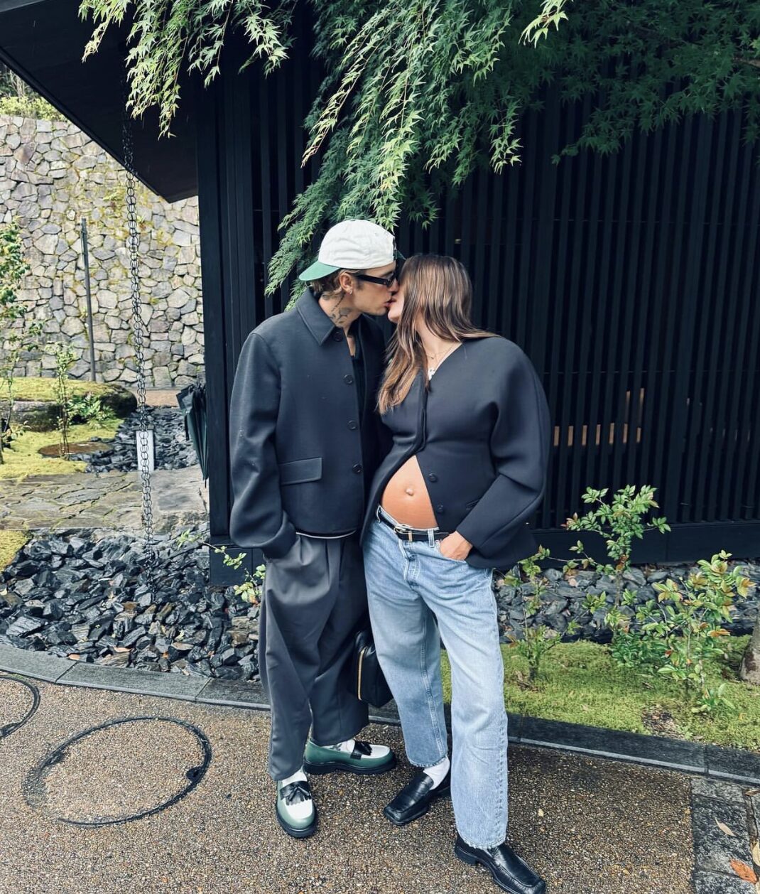 На размещенных кадрах в сети Хейли позировала вместе с мужем на улице в Японии. Модель облачилась в черный образ, состоящий из джинс и пиджака. Она расстегнула несколько пуговиц и показала свой округлившийся живот.