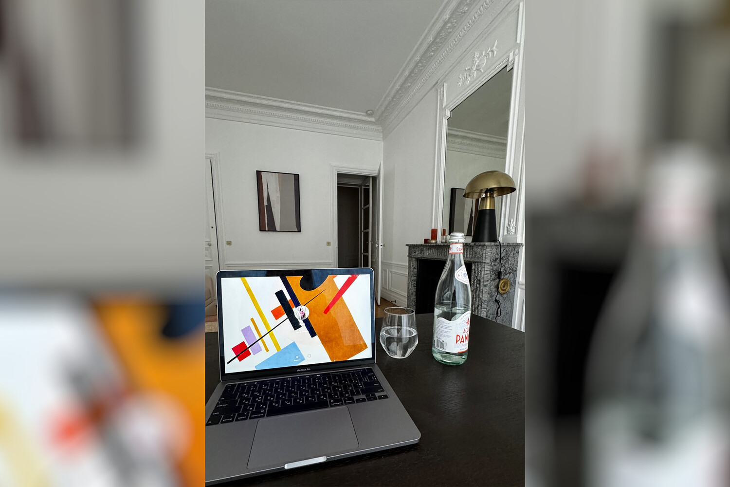 Интерьер квартиры выполнен в классическом стиле с белыми стенами, мраморным камином, золотой лампой и картиной в современном исполнении. На снимке певица сидит за столом, работая в ноутбуке.