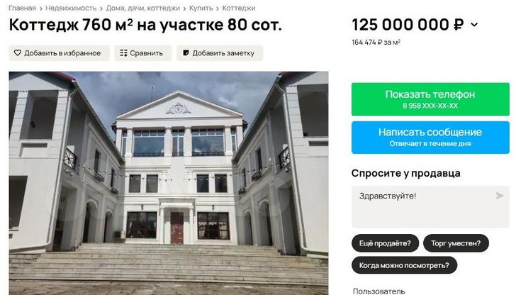 Изначально за дом просили 225 миллионов рублей, сейчас — 125 миллионов рублей. Площадь трехэтажного дома составляет около 760 кв. м, он находится на реке Истре в Московской области. В собственность входят участок на 80 соток и бассейн.
