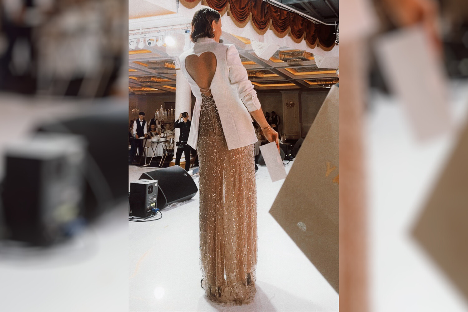 На мероприятии она появилась в блестящем комбинезоне, украшенном стразами. Кроме того, телеведущая дополнила свой образ белым жакетом с вырезом на спине в форме сердца, балетками, серьгами и золотым браслетом.