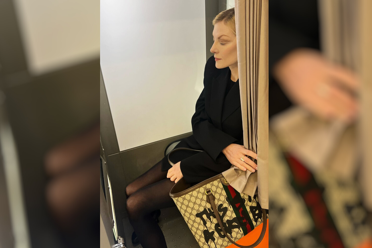 Позировала артистка с закрытыми глазами, и слегка прикрываясь шторой и облачившись в одежду любимого черного цвета. На ней были колготки, мини-платье и жакет. Рядом она поставила жаккардовую сумку-тоут из коллаборации Gucci x Balenciaga 2021 года. Стоимость изделия составляет $4200 (около 370 тысяч рублей по текущему курсу).