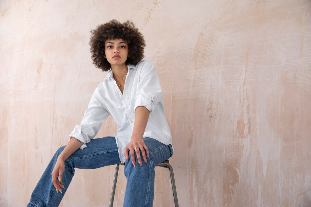Обратите внимание на посадку джинсов. Если бедра широкие, нам лучше выбирать высокую посадку на джинсы. Если бедра узкие, то мы можем выбирать низку посадку.