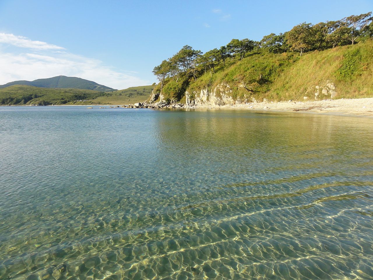 Так, вид действительно восхитительный – вода лазурного цвета, нежно-голубое небо, изумрудная трава и мало отдыхающих. Речь идет о бухте Астафьева в Хасанском округе.