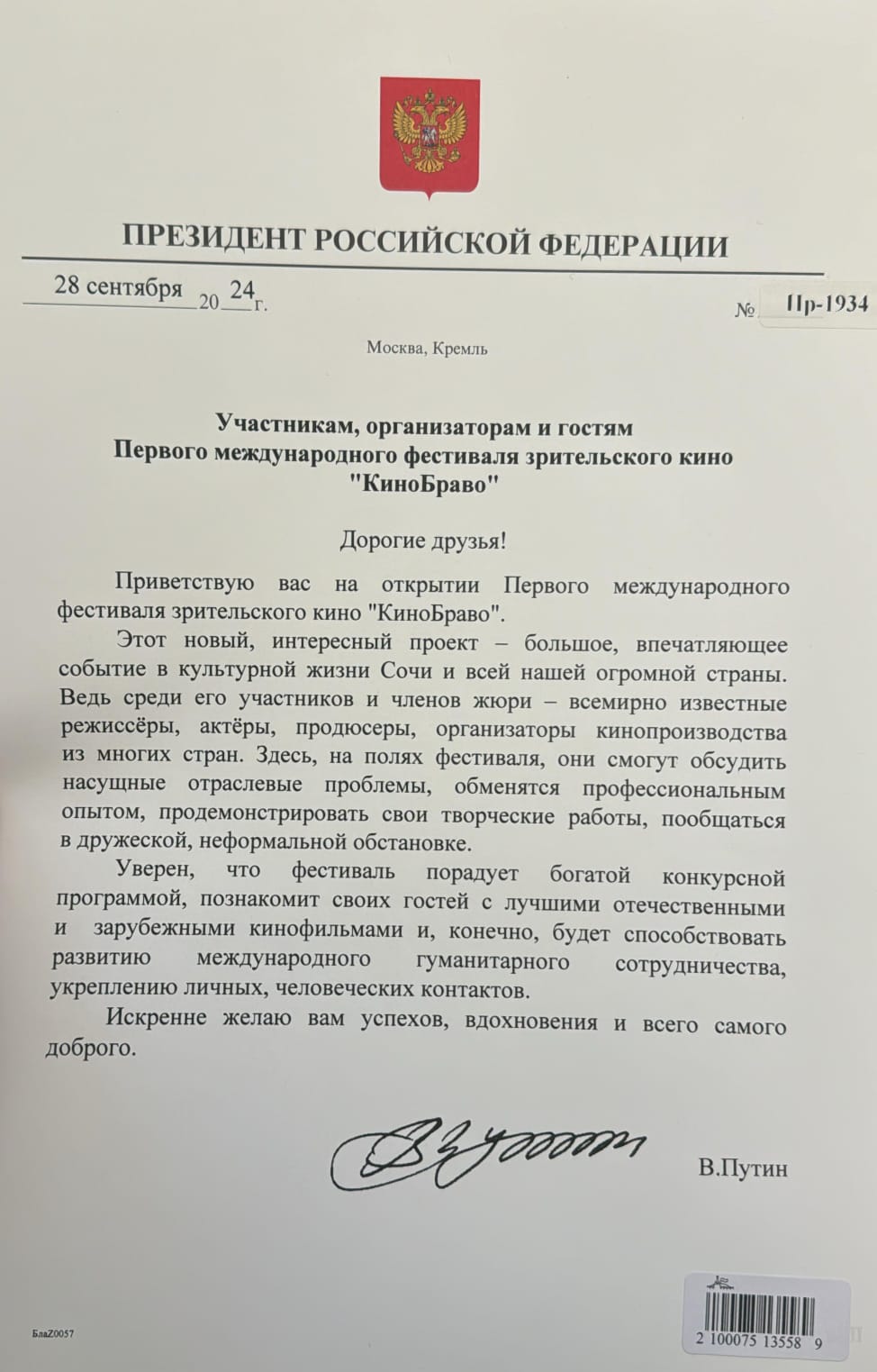 «Дорогие друзья! Приветствую вас на открытии Первого Международного фестиваля зрительского кино «КиноБраво»! – говорится в письме Президента РФ. – Этот новый интересный проект и большое, впечатляющее событие в культурной жизни Сочи и всей нашей огромной страны. Ведь среди его участников и членов жюри – всемирно известные режиссеры, актеры, продюсеры, организаторы кинопроизводства из многих стран. Здесь, на полях фестиваля, они смогут обсудить насущные отраслевые проблемы, обменяться профессиональным опытом, продемонстрировать свои творческие работы, пообщаться в дружеской неформальной обстановке. Уверен, что фестиваль порадует богатой конкурсной программой, познакомит своих гостей с лучшими отечественными и зарубежными кинофильмами и, конечно, будет способствовать развитию международного гуманитарного сотрудничества, укреплению личных человеческих контактов. Искренне желаю вам успехов, вдохновения и всего самого доброго».