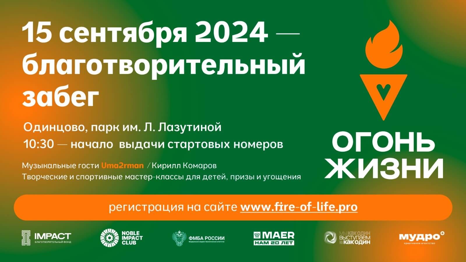 «Русская Медиагруппа» выступила коммуникационным партнером благотворительного забега «Огонь жизни», который состоится в Одинцовском парке культуры имени Ларисы Лазутиной 15 сентября.