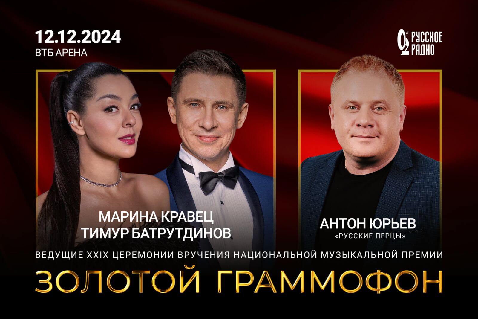 12 декабря на сцене ВТБ Арены состоится главное музыкальное шоу года – XXIX Церемония вручения национальной музыкальной Премии «Золотой Граммофон». Шоу-бизнес и его поклонники замерли в предвкушении: кто же в этом году станет ведущими это легендарной церемонии. И вот, наконец, «Русское Радио» раскрыло секрет. На сцену выйдут яркие, невероятные харизматичные Тимур Батрутдинов и Марина Кравец. И это еще не все!