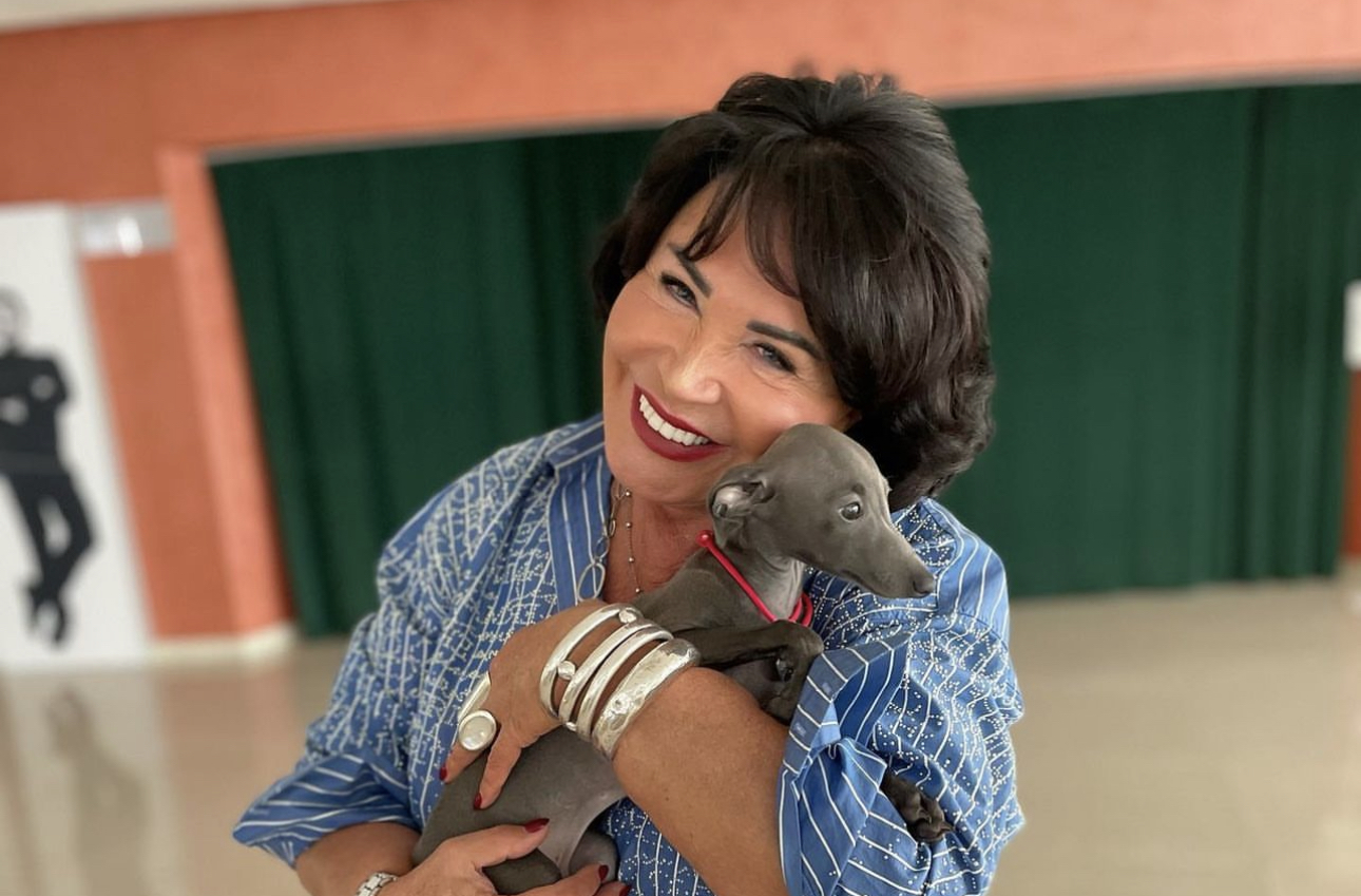 На снимке 74-летняя артистка позирует в ярком синем платье в горох с букетом тюльпанов.